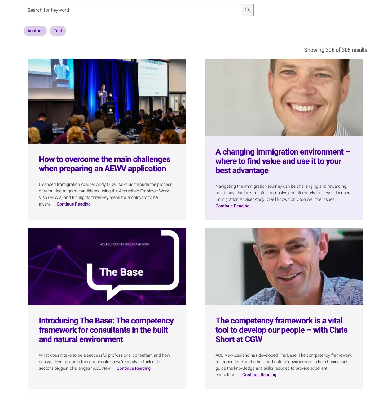 Activated via tag module_card_grid - this module creates a grid of cards for each published blog post in the news blog. There is also a data tag module_card_grid:insights-data which pulls in data from the page tagged insights-data. It currently uses this data tag as the insights posts are not child of dev_insights - but of the live insights page. There is a keyword search which lets users type to filter down results, and you also have the ability to add filter tags by tagging an individual blog post filter:XXX where XXX is the name of the filter.