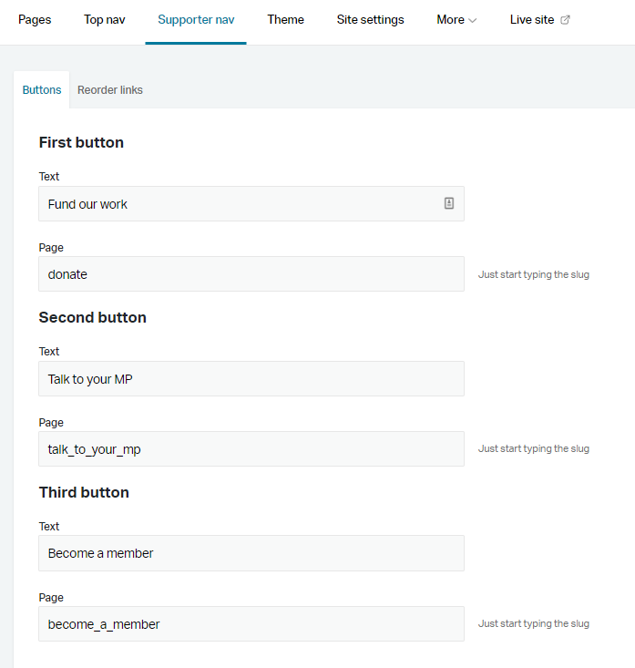 The "Fund our work", "Talk to your MP", and "Become a member" links are set via the supporter nav buttons here: https://caha.nationbuilder.com/admin/sites/1008/buttons