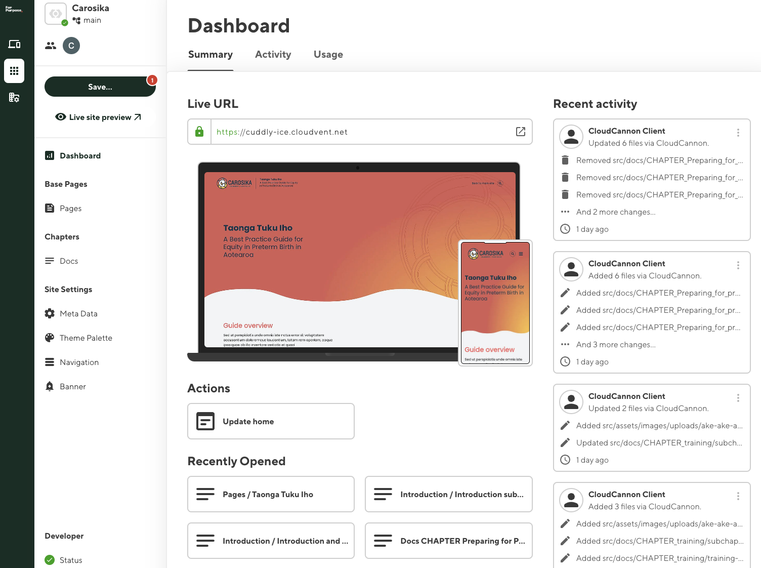 You will see the main dashboard. The main things to note are the main site menu on the left, and the recent activity on the right.