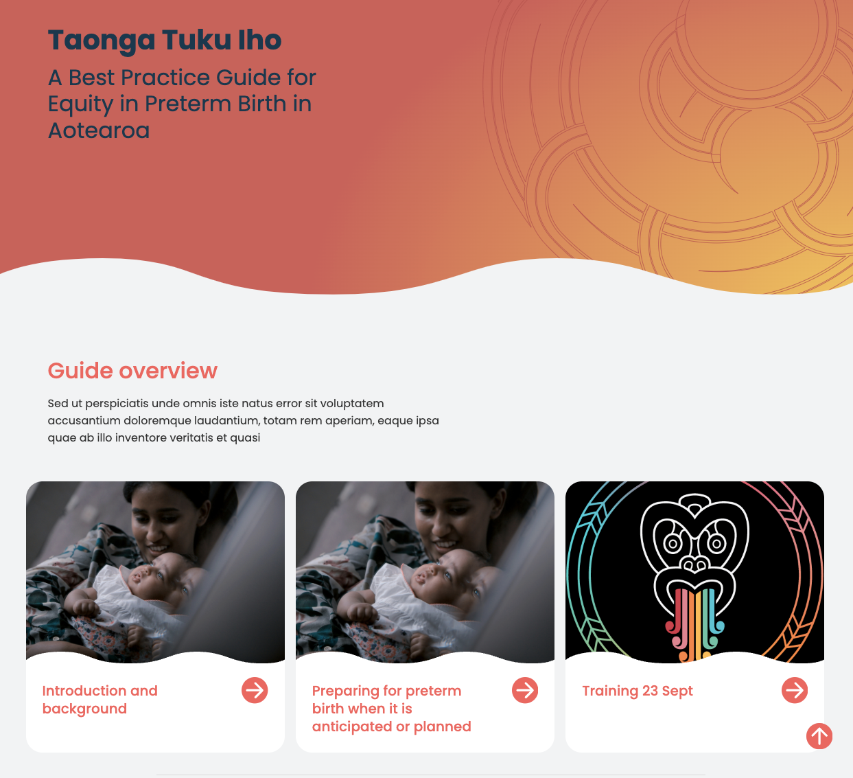 The Guide Overview (the home page) displays each chapter of the guide as cards. Clicking on a chapter card takes the user to the Chapter Introduction.