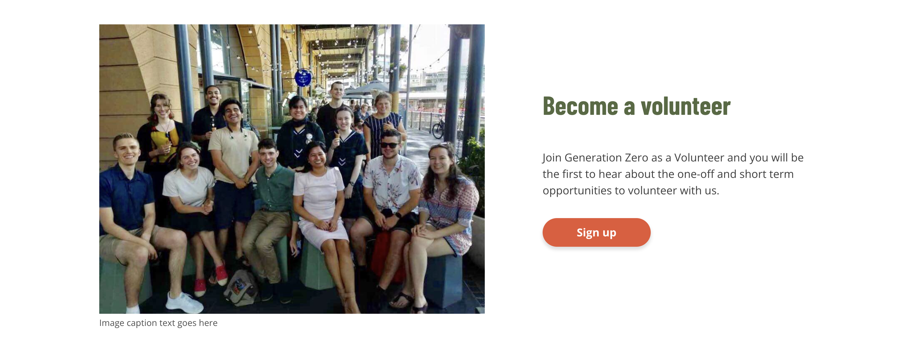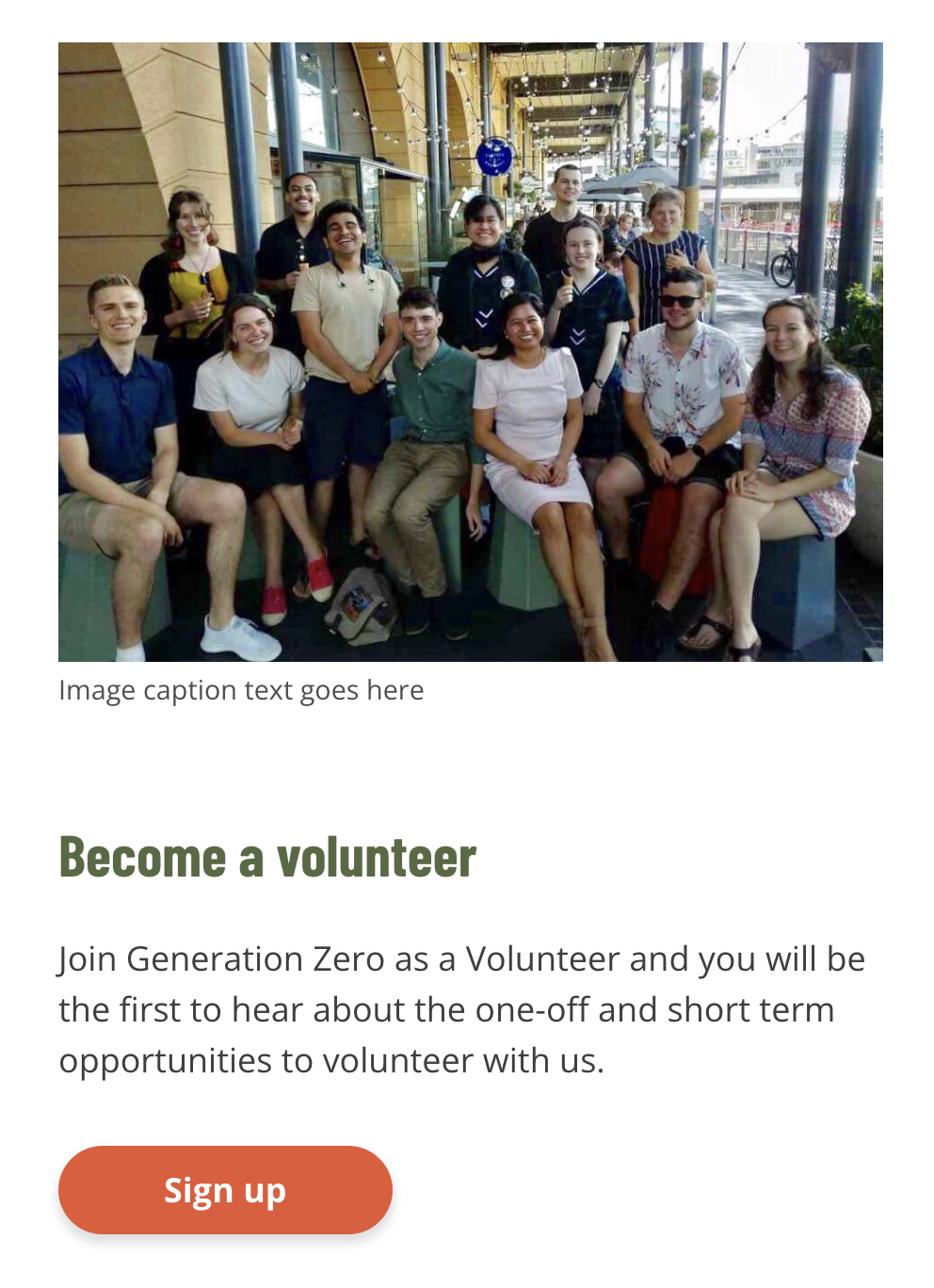 - content = "Join Generation Zero as a Volunteer and you will be the first to hear about the one-off and short term opportunities...........Sign up" (stylized link with class "btn" in the WYSIWYG editor code view)