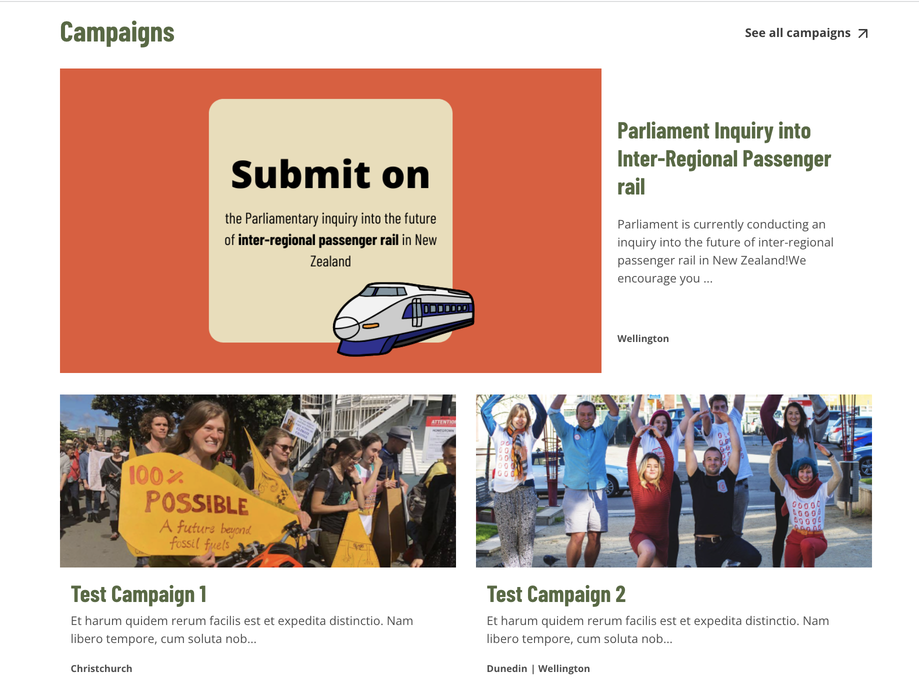 Basic subpage module, activated by adding tag module_latest_campaigns.