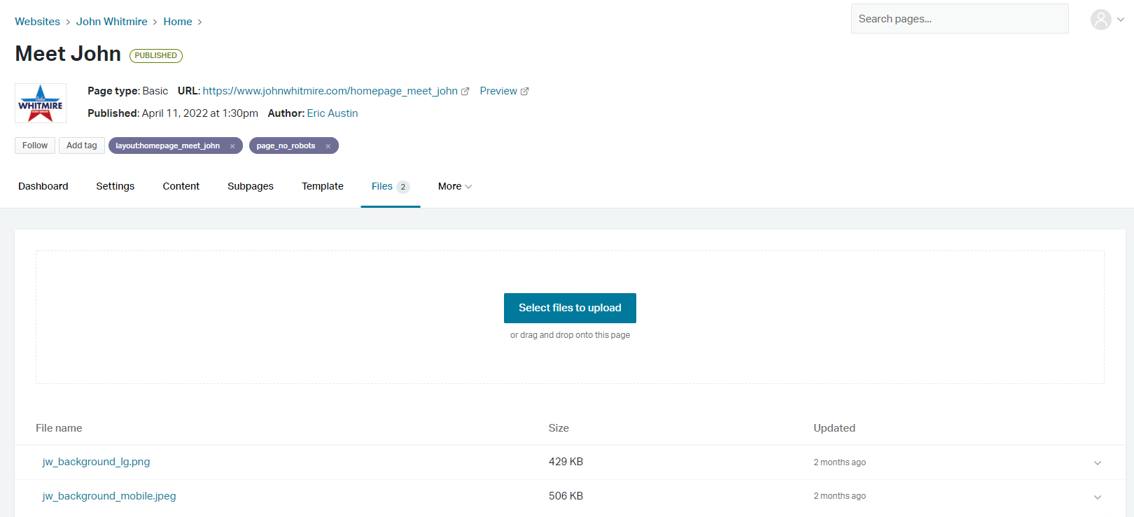 Meet John (on homepage): https://whitmire.nationbuilder.com/admin/sites/2/pages/120/edit