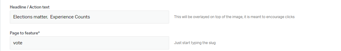 Currently the slider displays a background video. This video cannot be swapped out from the Nationbuilder control panel. This requires a developer to make the change.