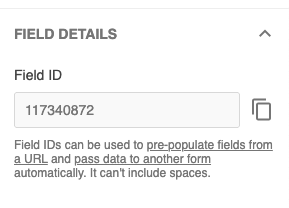 - In 123 Form Builder: Click on the "User ID" field, click the cog, then scroll down to the bottom of the form on the right, click FIELD DETAILS, then copy the Field ID