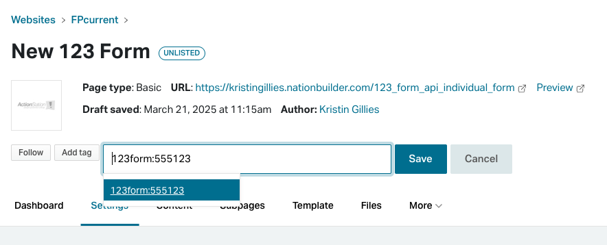 This is done by setting up a host page in Nationbuilder and using page tags to activate the desired 123 Form.