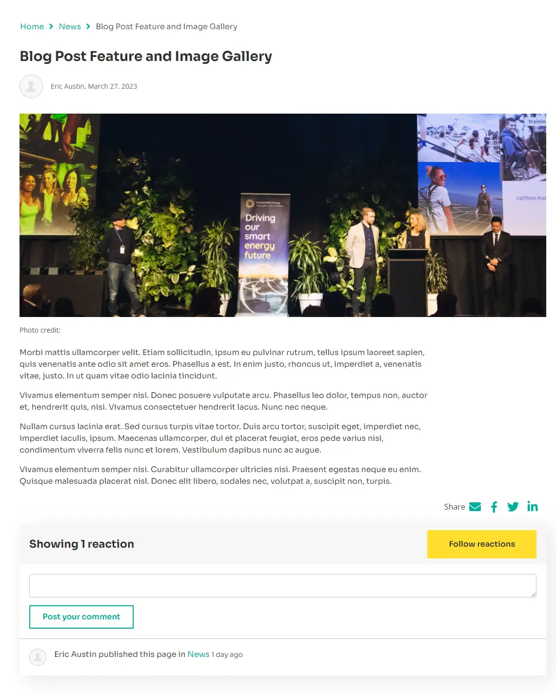 If a blog post has any feature image slider data - we grab the first one and use it as the feature image at the top of the blog post. The feature headline is then used as Photo credit or description, and will appear beneath the feature image.