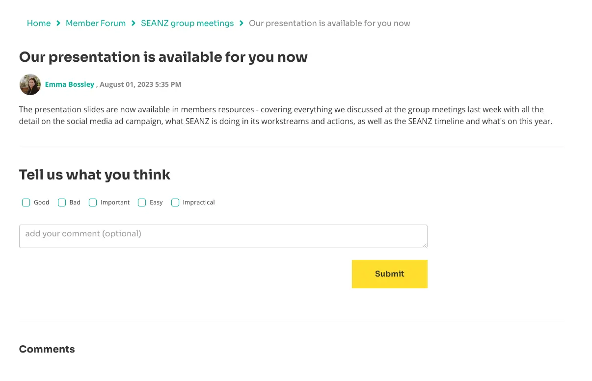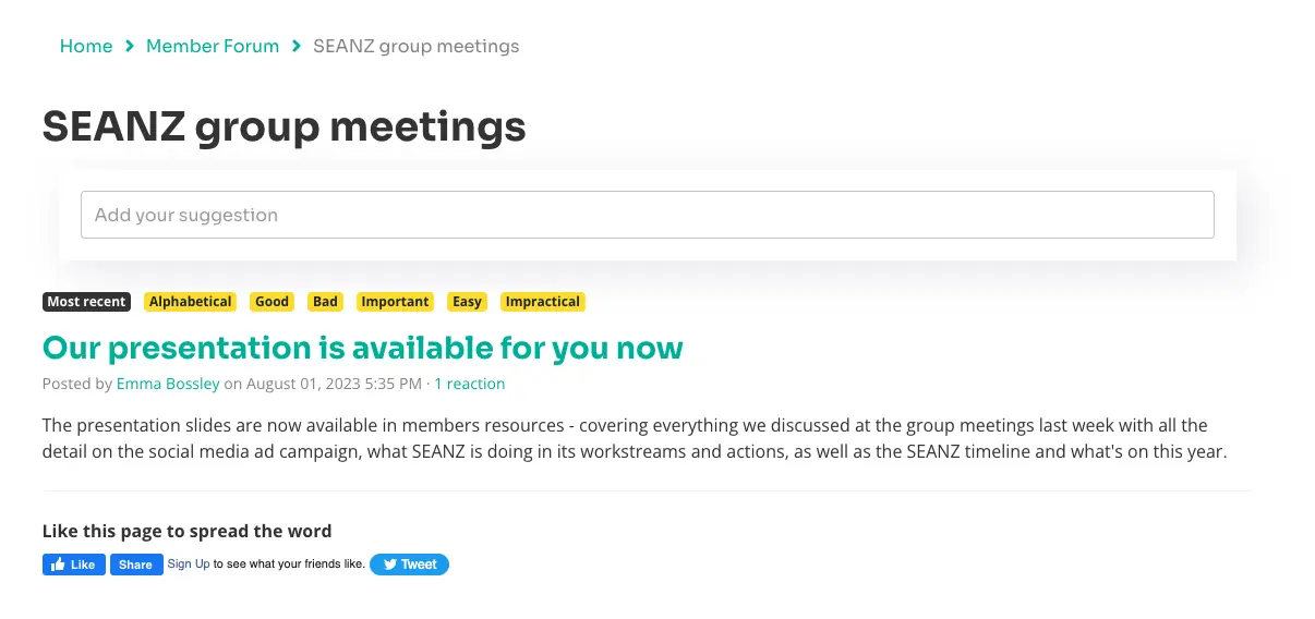 The individual forum posts are Suggestion Box pages - created by SEANZ admins. When there is a published Suggestion Box subpage here - individual member users can Add a suggestion (Create a post) or comment on existing suggestions
