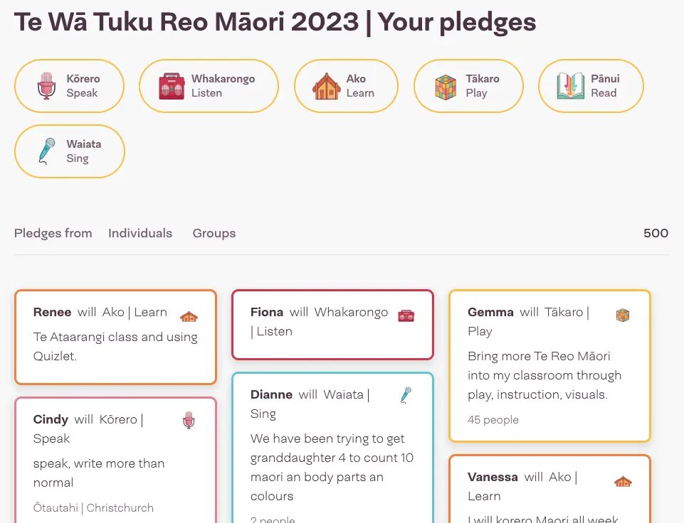 This page has a grid that allows users to view all pledges made by users for Te Wiki 2023. The grid will initially load in the 500 latest pledges. At the bottom of the page is a "Load more" button which will fetch an additional 500 pledges.