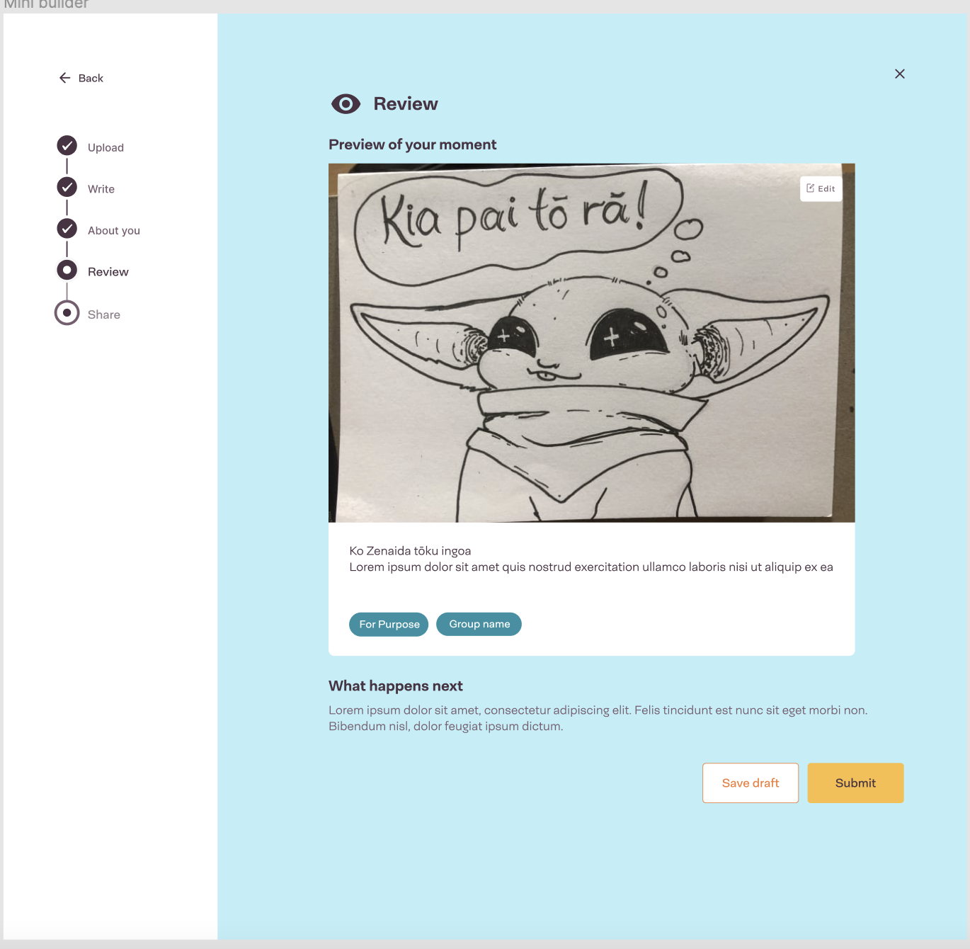 - The Reviw step shows a formatted final version of their post so they can review it. It shows the users media, text, tags, etc.