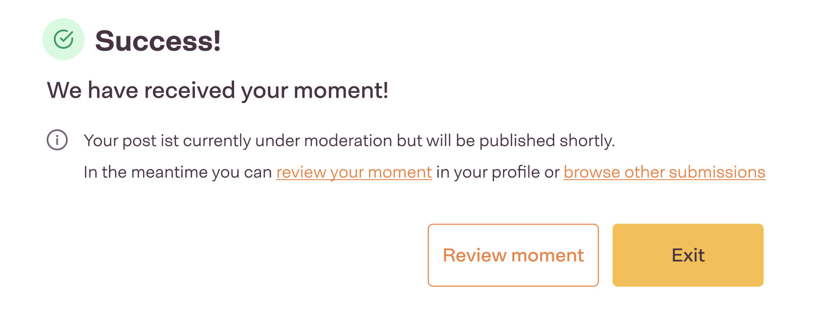 - There is configurable "What happens next" text, usually informing the user how the post needs to be moderated after submission.
