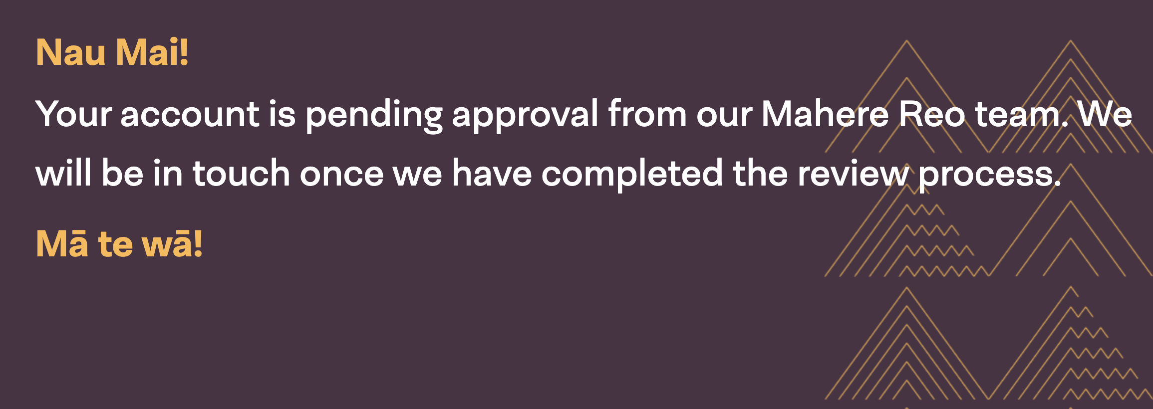 The user will then be automatically signed in - but since they are not yet approved (manually process done by Te Hiringa) we can display a message. Please let us know what text you want here.