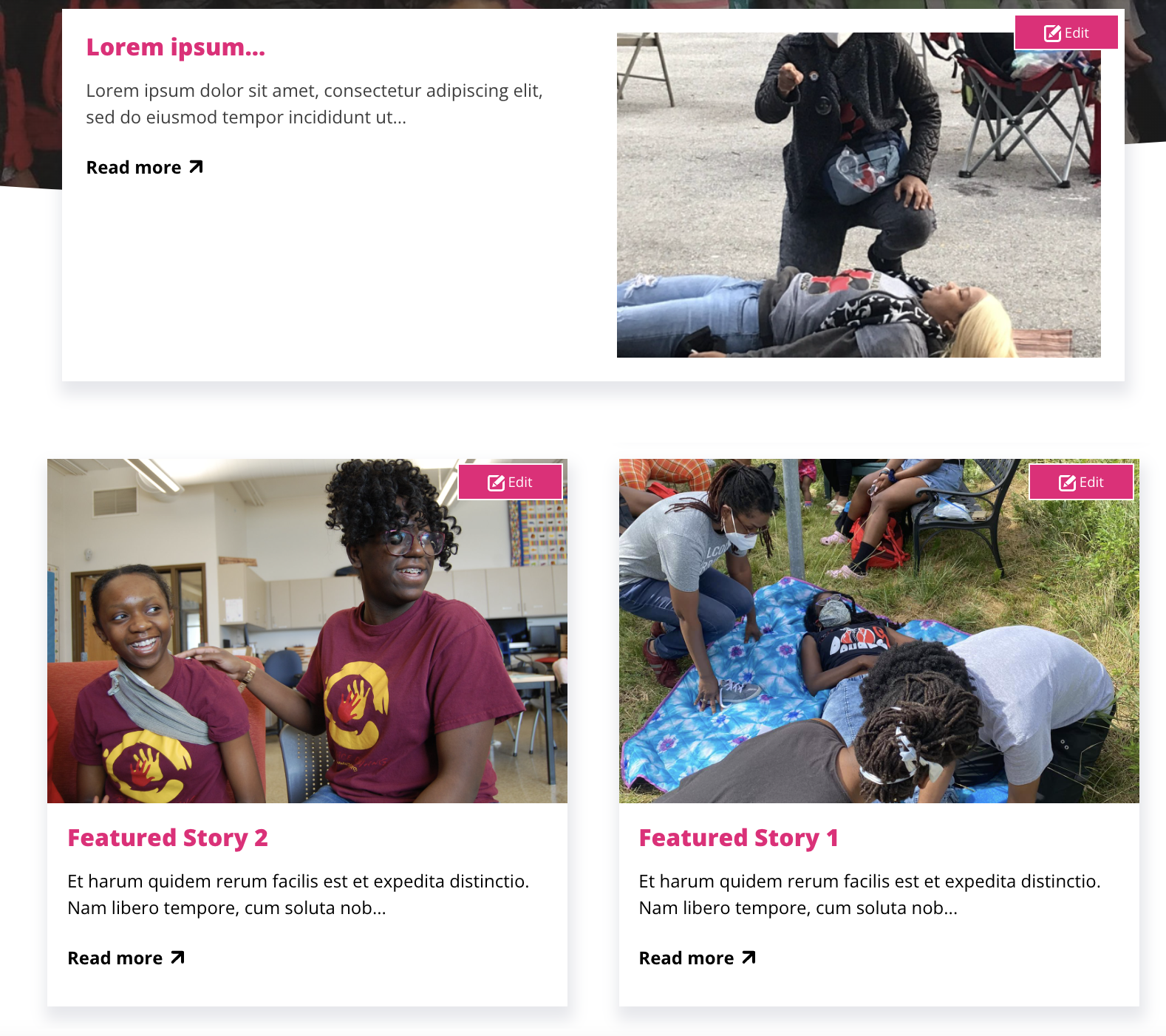 The module has one “hero” and two “featured” stories. Tag the hero page hero_story and tag the featured pages featured_story