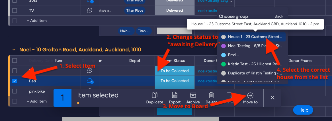- Once collected, select the item and change its status to "Awaiting Delivery" and move it into the group of the house it will be delivered with
