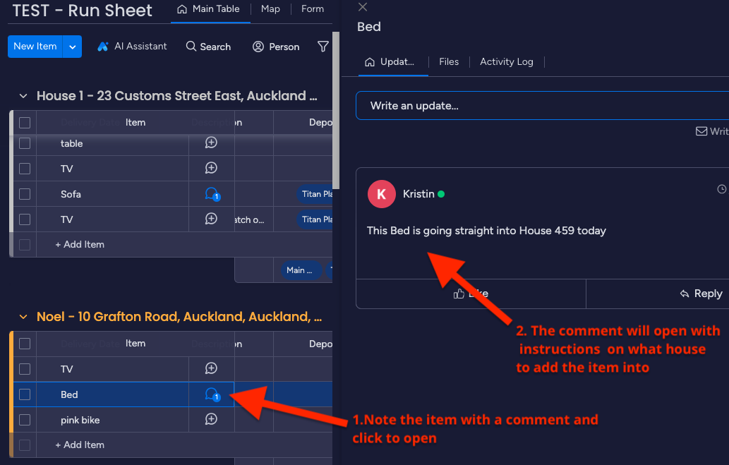 - We'll add a note after the house address to check the comments. Open the comment to see which house the item is going into.
