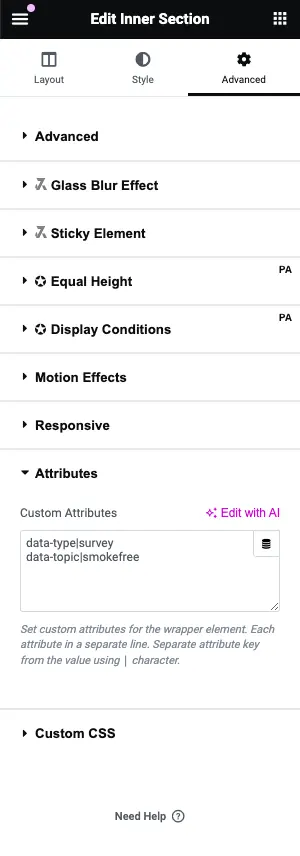 After selecting the Inner Section you want - in the other menu - go "Advanced" and open "Attribute" - here is where we configure the valid filter options.